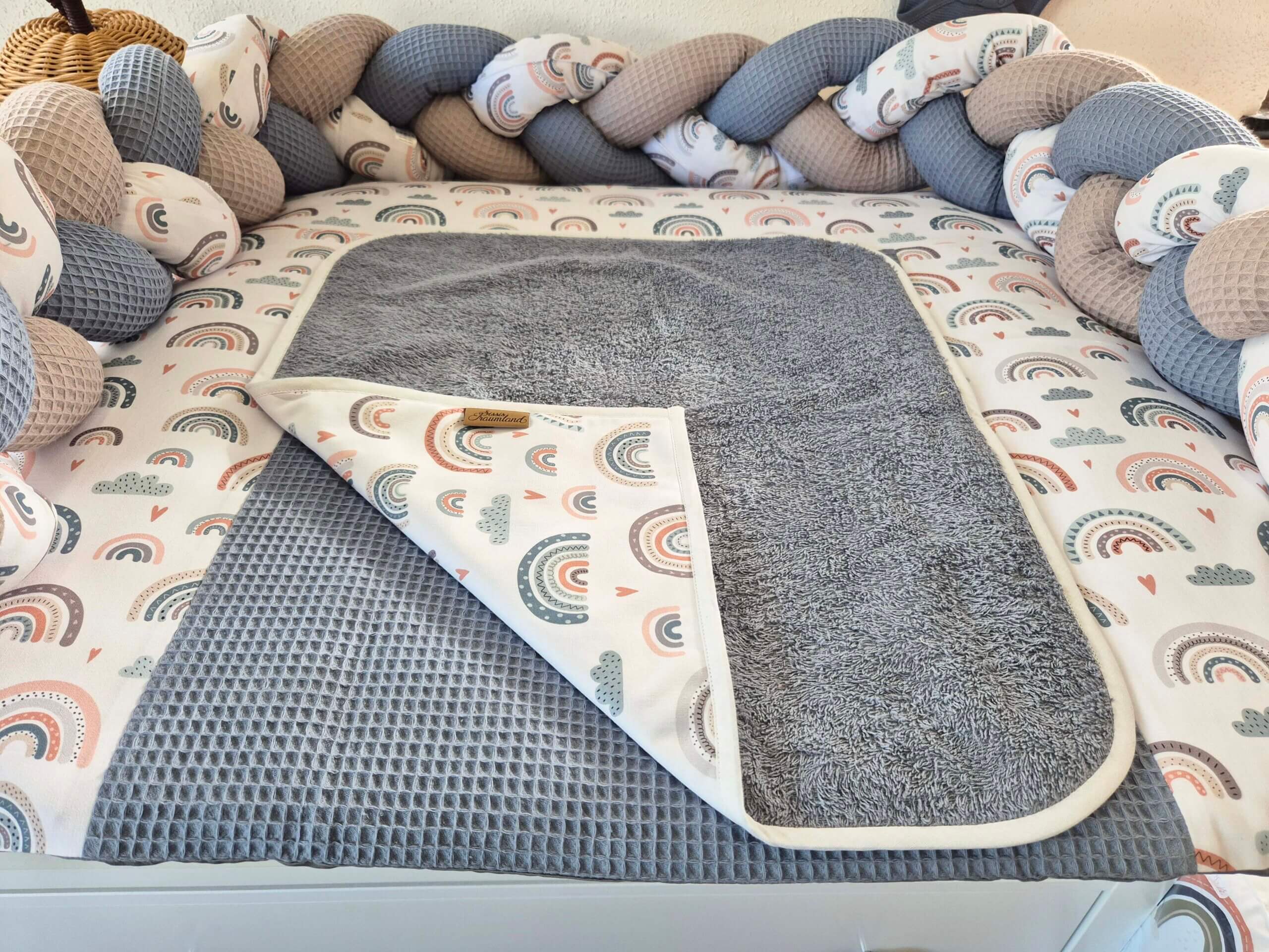 Die Wickelunterlage besteht aus einer kuscheligen Frotteeseite und einem wasserundurchlässigen Stoff im Inneren der Wickelunterlage.